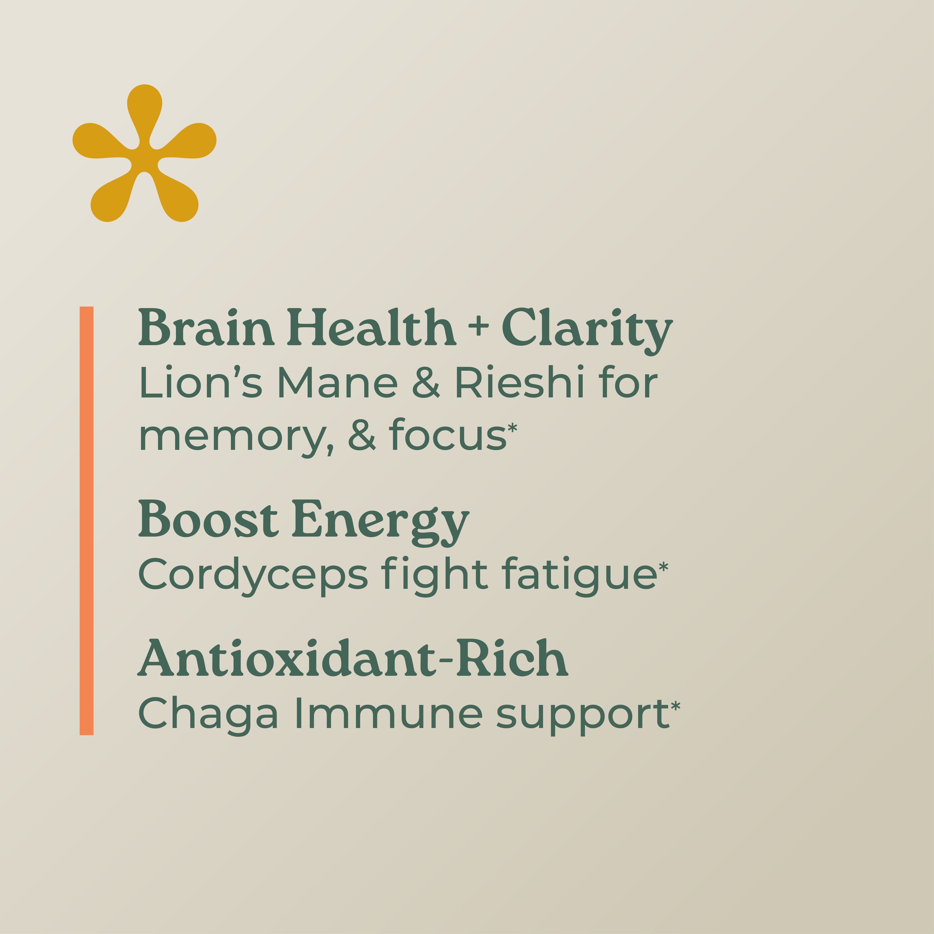 Key Blend: Includes Lion's Mane (Focus), Reishi (Calm), and Cordyceps (Energy).